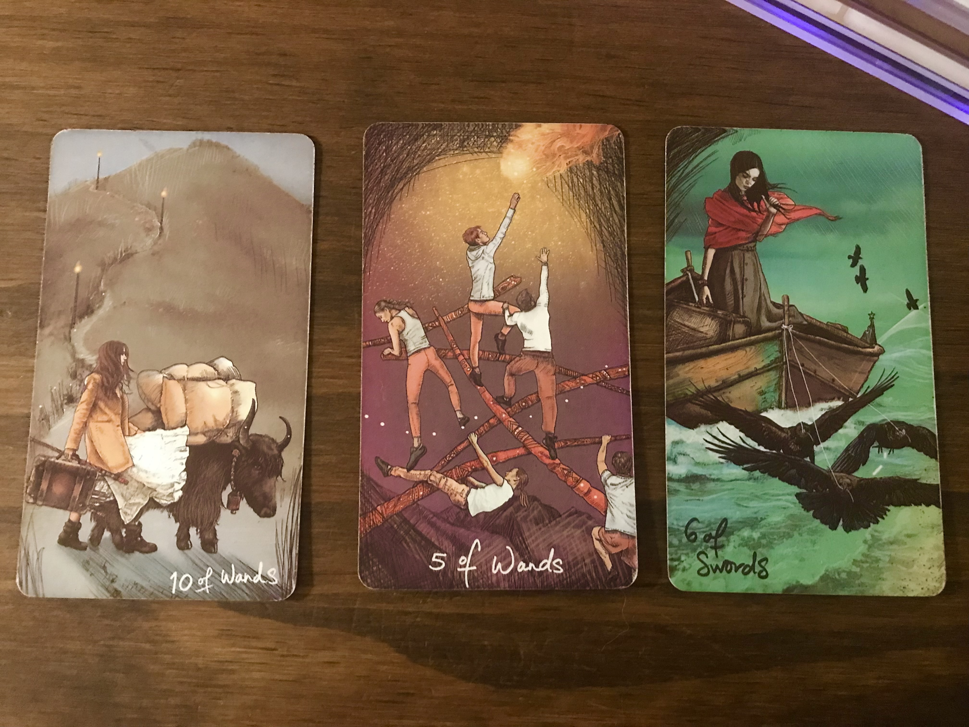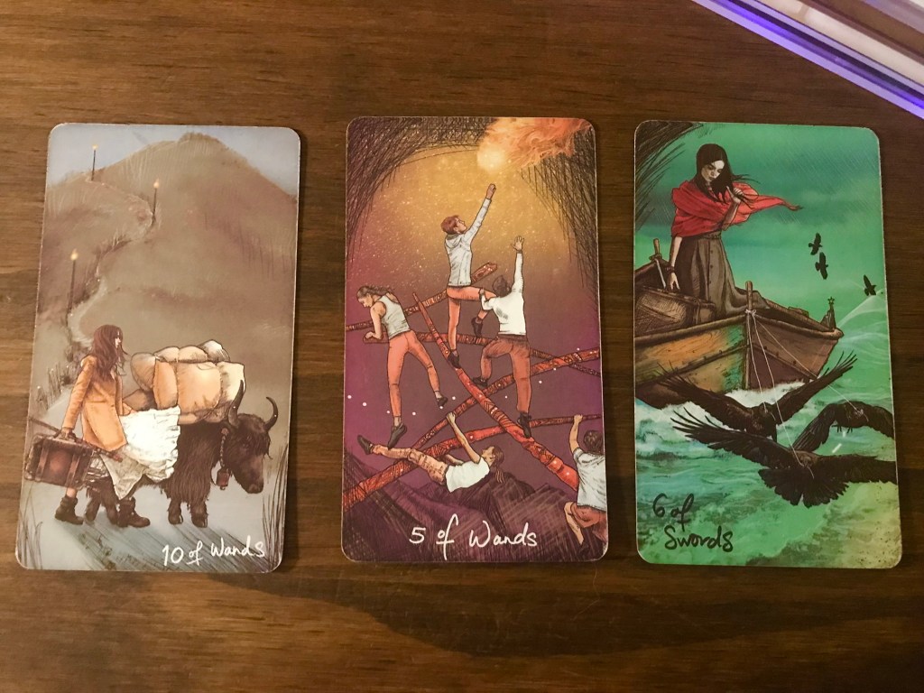10 of Wands, 5 of Wands, 6 of Swords [The Lightseer Tarot]