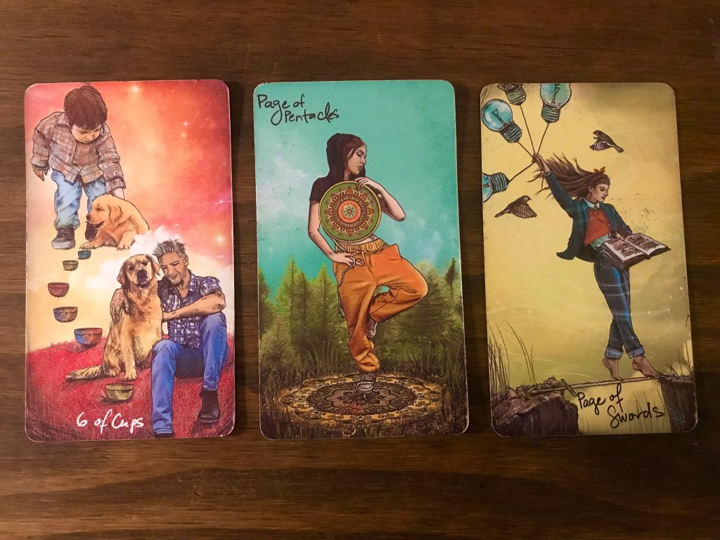 Six of Cups, Page of Pentacles, Page of Swords