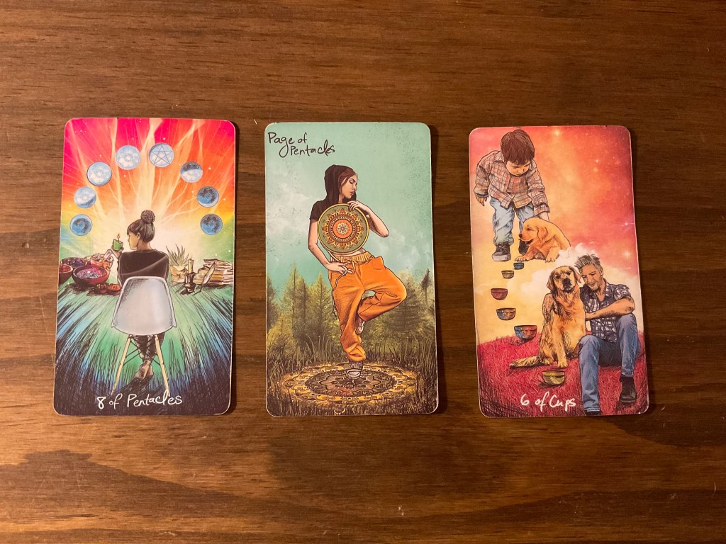 Hello, friend. Welcome back to my kitchen table—I’m delighted to have you. If this reading is for you, I hope you find my assessment and guidance helpful. If not, I hope you may take away something useful anyway—perhaps some insight into how different combinations of the same cards can represent distinct situations. However, since this is not the first time we’ve seen these cards this week—6 of cups and Page of Pentacles have shown up together three times now, and 8 of pentacles in a second context—I do feel that this is repeating energy to a degree. This will date me a little, but in my mind I hear the handshaking noise from back in the day when we used modems to connect to the internet. The crunchy, ping-ponging screech signified the modems talking to one another to find common ground for connection speed. A 28.8K modem can’t connect any faster than that, so it has to tell the other modem so it can be met at its capability. So with that in mind, this combination and order, at first glance, tells me that someone has to slow their roll and accept the limitations influencing their choices and the directions they can go in; that more focused work is required to plant a seed of change; and that frequent contemplation of the past indicates something that must be dealt with instead of ignored and stashed away.