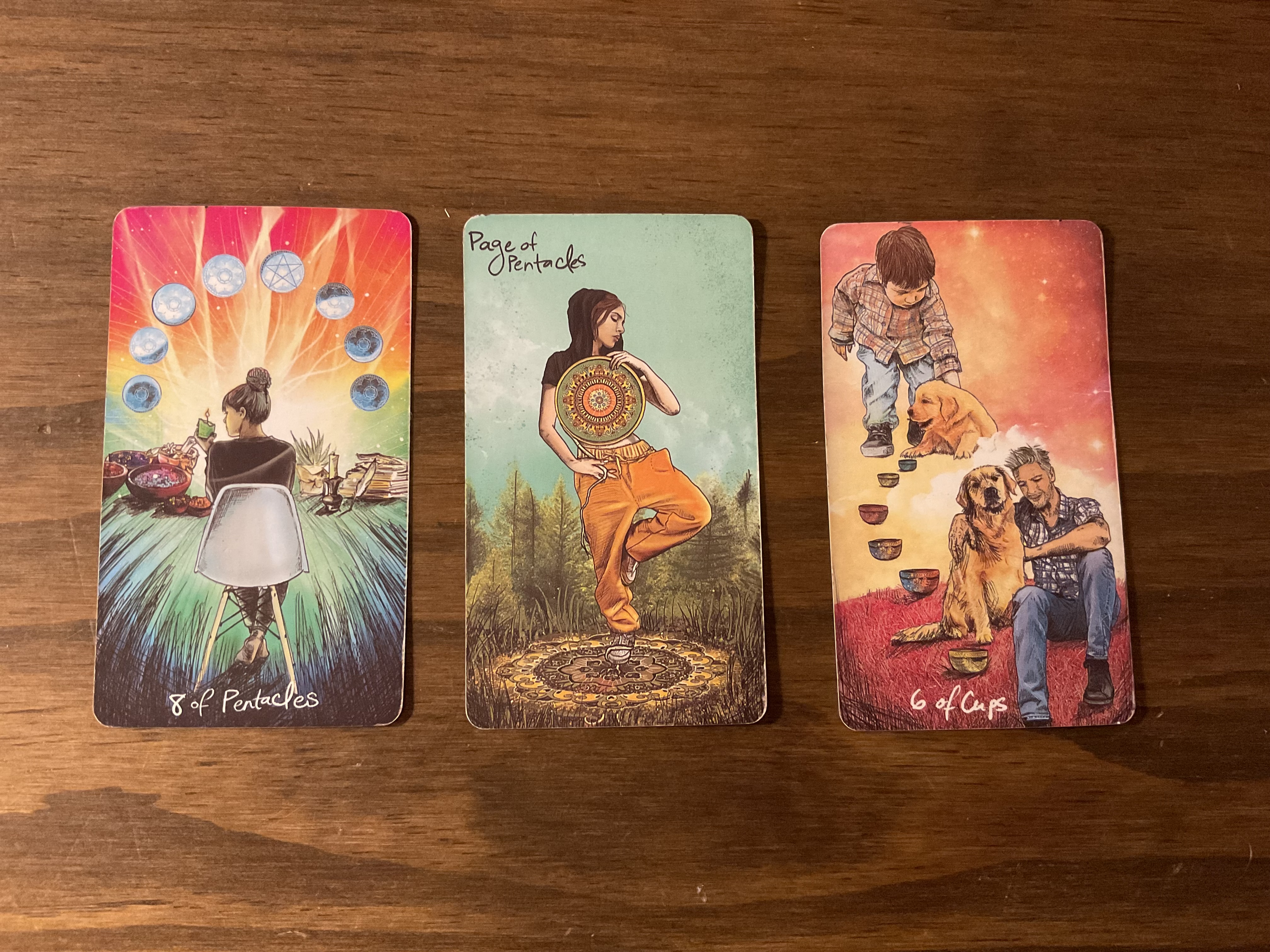 Hello, friend. Welcome back to my kitchen table—I’m delighted to have you. If this reading is for you, I hope you find my assessment and guidance helpful. If not, I hope you may take away something useful anyway—perhaps some insight into how different combinations of the same cards can represent distinct situations. However, since this is not the first time we’ve seen these cards this week—6 of cups and Page of Pentacles have shown up together three times now, and 8 of pentacles in a second context—I do feel that this is repeating energy to a degree. This will date me a little, but in my mind I hear the handshaking noise from back in the day when we used modems to connect to the internet. The crunchy, ping-ponging screech signified the modems talking to one another to find common ground for connection speed. A 28.8K modem can’t connect any faster than that, so it has to tell the other modem so it can be met at its capability. So with that in mind, this combination and order, at first glance, tells me that someone has to slow their roll and accept the limitations influencing their choices and the directions they can go in; that more focused work is required to plant a seed of change; and that frequent contemplation of the past indicates something that must be dealt with instead of ignored and stashed away.