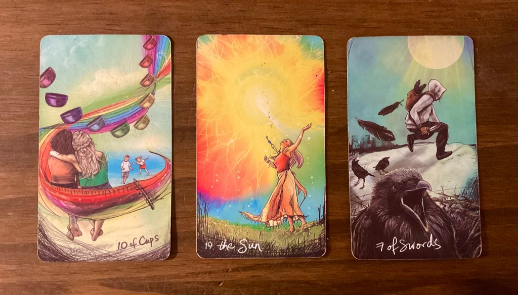 Hello friend, and welcome to my kitchen table. If you are a return visitor, hey, thanks for stopping by again! If you are new, come on in—I’m glad to have you. I do short “snapshot” spreads here—currently three cards, generally explaining a person, a situation, and something that underlies those things, or points to potential in something that sets the scene for an outcome. The intent in my guidance is not to direct or influence behavior and choices, but to offer my understanding. So often our problems can leave us feeling lonely and isolated—that nobody could understand our situations, our relationships, our most painful anxieties. I’m here in part to let you know that you aren’t alone. I can’t judge you. You are a human being experiencing your humanity, and if you’re exploring energy reading by way of tarot and oracle cards, then you’re honoring your spirituality as well. Anyhow: I am one person interpreting one strand of energy, so if this resonates, I hope it will help. If it’s not for you, I’m glad you’re here too. Let’s take a look, shall we?