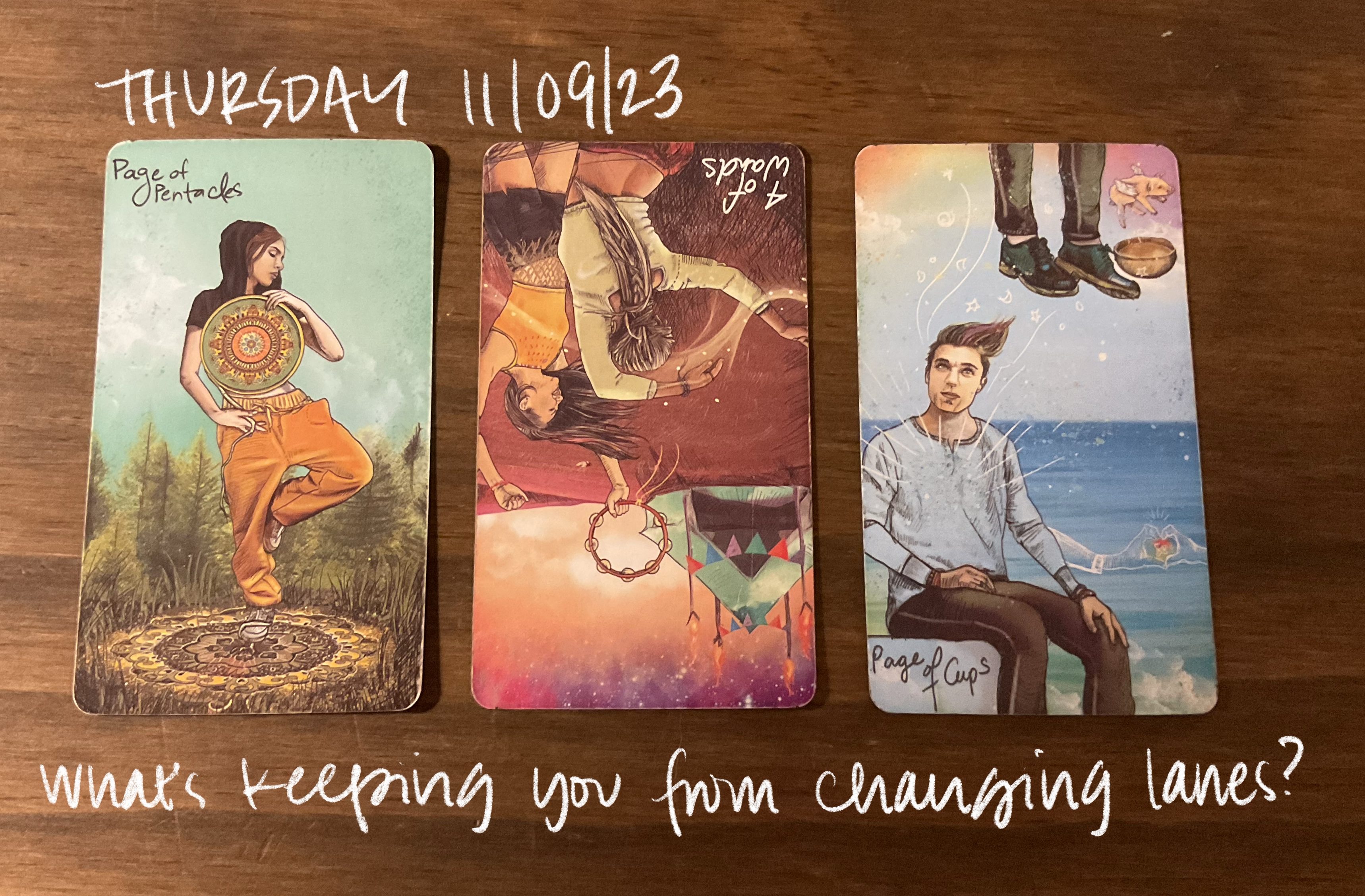 So the Page of Pentacles flew out of the deck on the first couple of shuffles, which gives me the sense that this is the same Page of Pentacles that popped up all over last weeks’ reads. There has been a shift in context for this Page, seen in the four of wands reversed, which can either transition into or prevent a coming change, depending on the strength of surrounding influence. The adventurous Page of Pents, full of excitement to get started manifesting their dreams into material reality, may be coming up against resistance to these plans by the very people around them that usually show support. Perhaps this change in direction might highlight the differences between them and their main social group or perhaps their family—people with lots of opinions and an overwhelming reluctance to see the Page make up their own mind and go against the flow. It may not be an active conflict, but tension and lack of clear communication—or a growing disconnect for the Page between their true self and the collective agreements of the group in question, a rift that grows with the Page’s conviction and need to set out on this different path. It’s a lot harder to block out the haters when they’re supposed to be your beloved friends, and if you’re not somewhat confident in yourself, listening to their doubts could prevent meaningful change. Although they are setting out to do something with the potential to bring in coin, if this Page can get on the road and stay there, they will find the love for which they are yearning and be transformed by it, into a Page of Cups.