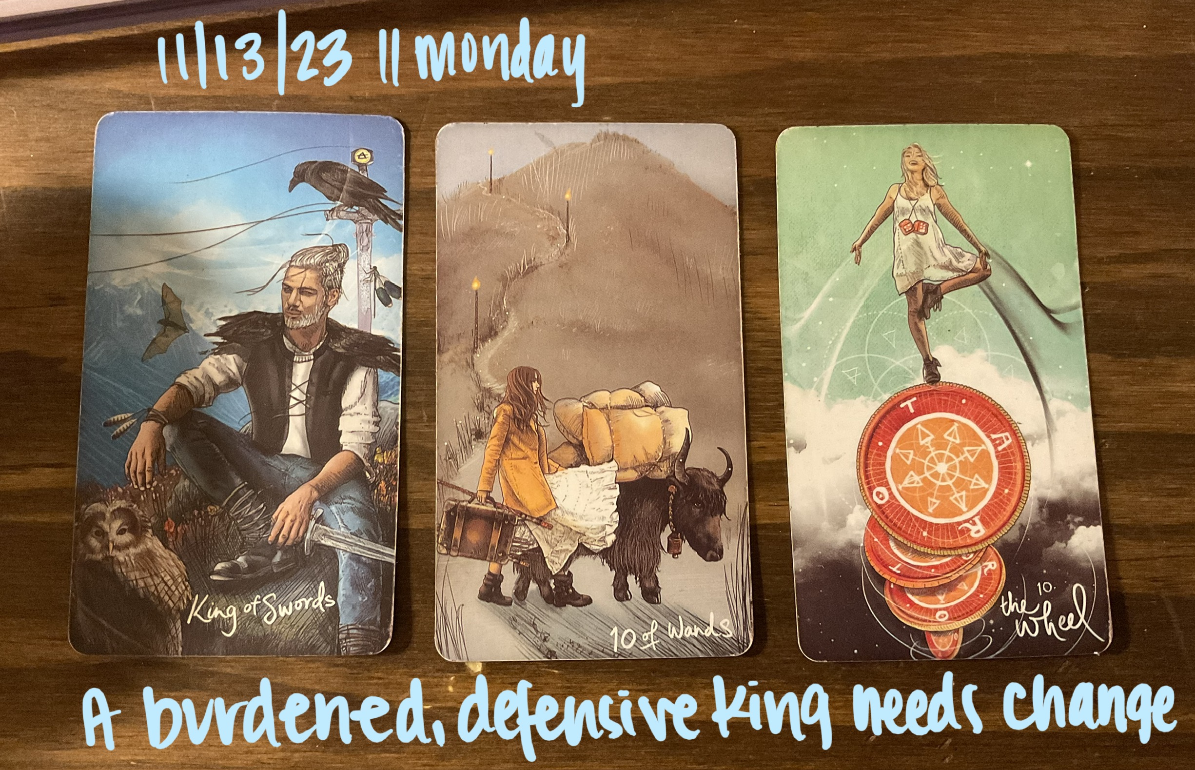 The vibe around you is chilly and defensive, but for good reason. The King of Swords—who I will refer to as he/him to stay consistent, but is not limited to masculine energies—is a figure who has been through enough to teach him some harsh lessons. He defends himself with the blade of what he has learned and what he knows; he is suspicious of anyone who tries to control him or challenge his hard-fought wisdom. The winged creatures that surround him are known as symbols of intelligence and wisdom (the owl and the corvid especially), and in the case of the bat and the dragonfly, rely on different sensory input to navigate the world. Bats use echolocation and the wings of dragonflies are lined with sensors that aid in navigation. Each being in this picture has their own particular gift for making their way through the world. For the King of Swords, it is tiring to constantly be second-guessed. Nobody would challenge an owl about the best way for it to find prey, but many are making assumptions and judgments about how the King manages his accomplishments, therefore calling into question the weight and value of said accomplishments. This puts the kind of burden on this king that he never asked for. The only true responsibility he has right now is for himself, but there are lots of people in his circle expecting too much, wanting him to take on more and more, especially to make up for the slack of others. In this 10 of Wands the figure has come a long way and is looking for the next opportunity to rest. Unfortunately it’s not that restful to be fighting for balance, almost in performance for others—today this figure on the Wheel of Fortune card is giving me Cirque du Soleil energy; it is commanding some control and power over the winds of change and fortune, almost showing off how well they go with the flow. This is what the King of Swords—assuming the role of the Stabby King, whose intellect and defenses would automatically dispense with challengers—would like to present to the world, but deep down in the center of it all he’s tired, crabby, regretful at not taking the easier route he was offered. If he can forgive himself for that, change and balance will come much easier, because he’ll be doing it for himself, not everyone else. If not, then the wheel could turn into more of a treadmill.