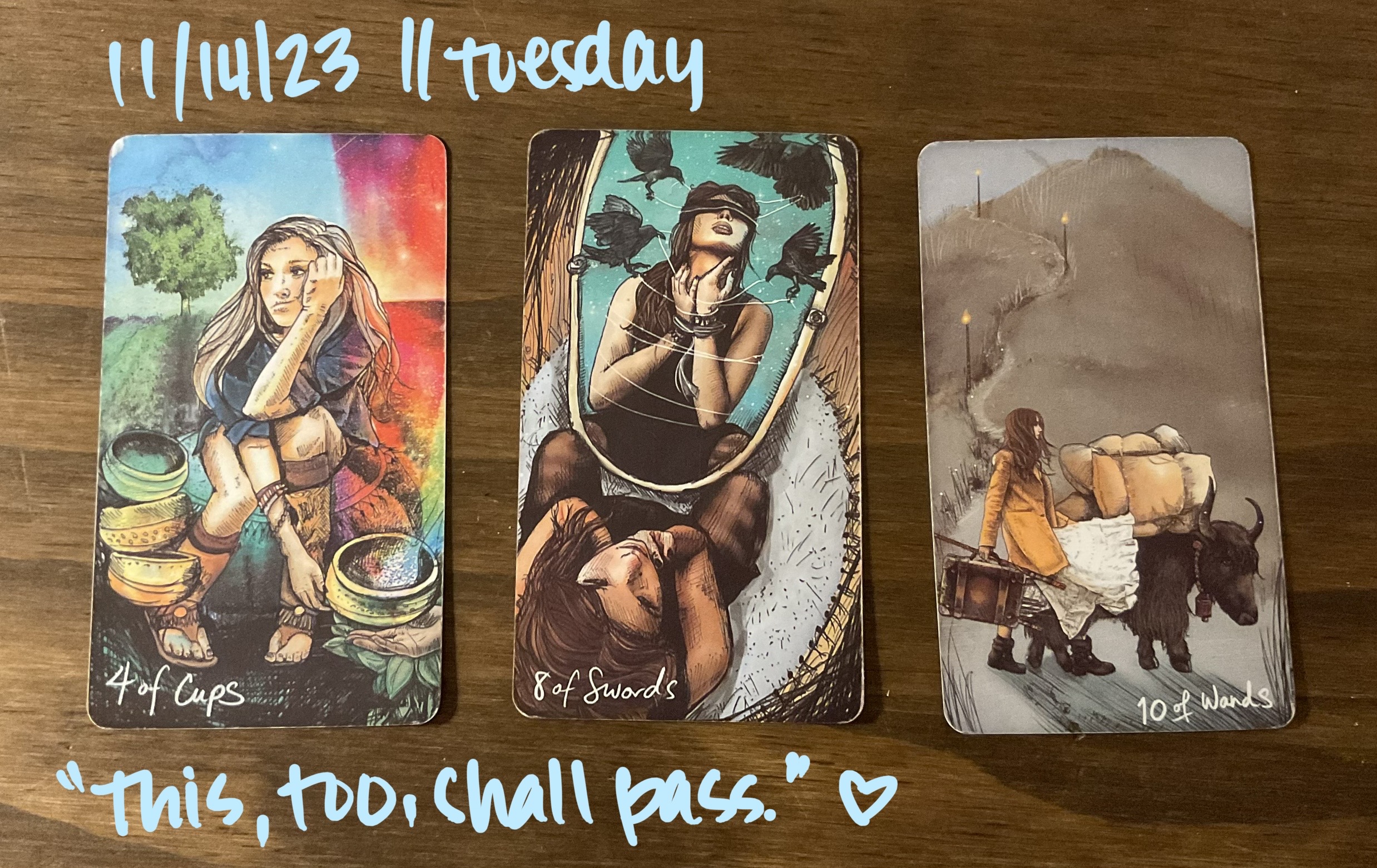 4 of Cups, 8 of Swords, 10 of Wands