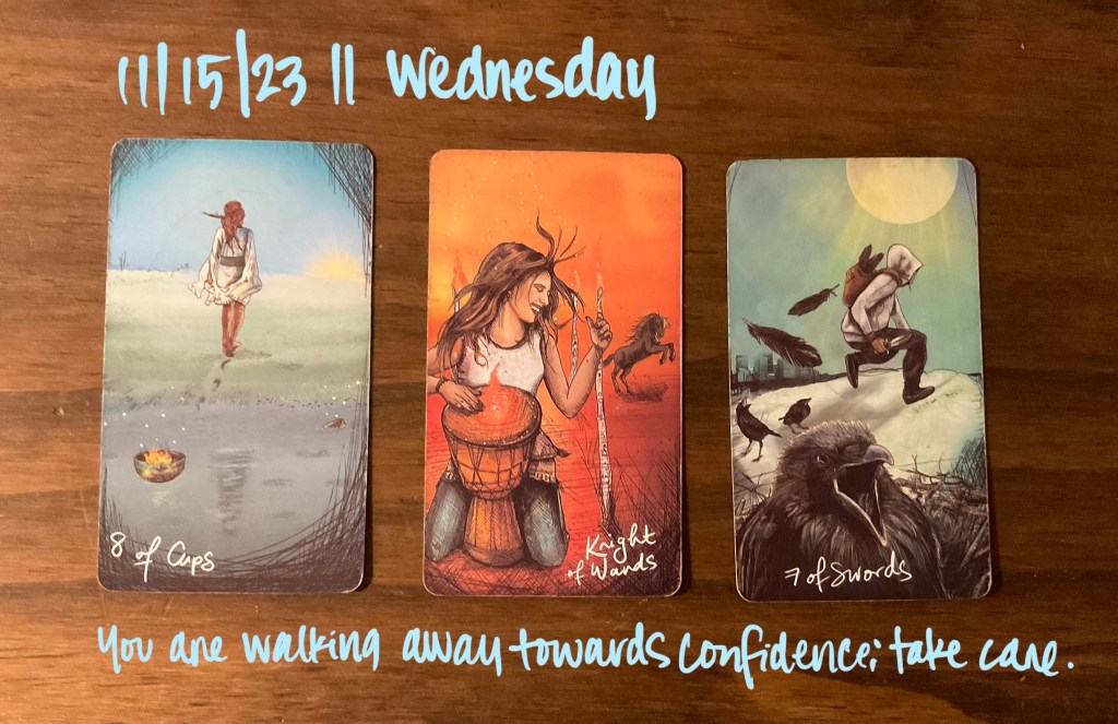 In this 8 of cups I feel something quite intense. I’m struck by the image of Julia Roberts in Sleeping With the Enemy (1991) as a “battered wife,” who fears for her very existence, going to great lengths to disguise herself and start over under an alias, making this an 8 of cups which is very wanted, warranted, and determined on the part of the one walking away. The underlying energy is one of hope (the card under the deck, not shown, is the Sun, which brings light, warmth, power, and healing), especially because it is followed by the fearless, adventurous Knight of Wands. The excitement and determination of this energy is someone who wants to live, who knows they haven’t been. Dwelling on the past, or returning to those 8 poison cups, will only fill your heart with fear of the unknown—right now you have enough vim and vinegar to wrestle a bear (spiritually speaking), and moving forward is the only way to level out that elevated state. There is a sense of making up for lost time. Be careful not to be too frenetic. You will have your opportunity, some day, to reconcile the loss/exit costs you have experienced with the exciting, free-form future all around you. Though the 8 of Cups from which you walked may have convinced you of your powerlessness, weakness, and inferiority for a time, the magic of opportunity and learning healthy ways to process overwhelming emotions in your own way—free of negative, naysaying influences—will help you see your value and keep from lashing out from a place of contrary/oppositional anger.