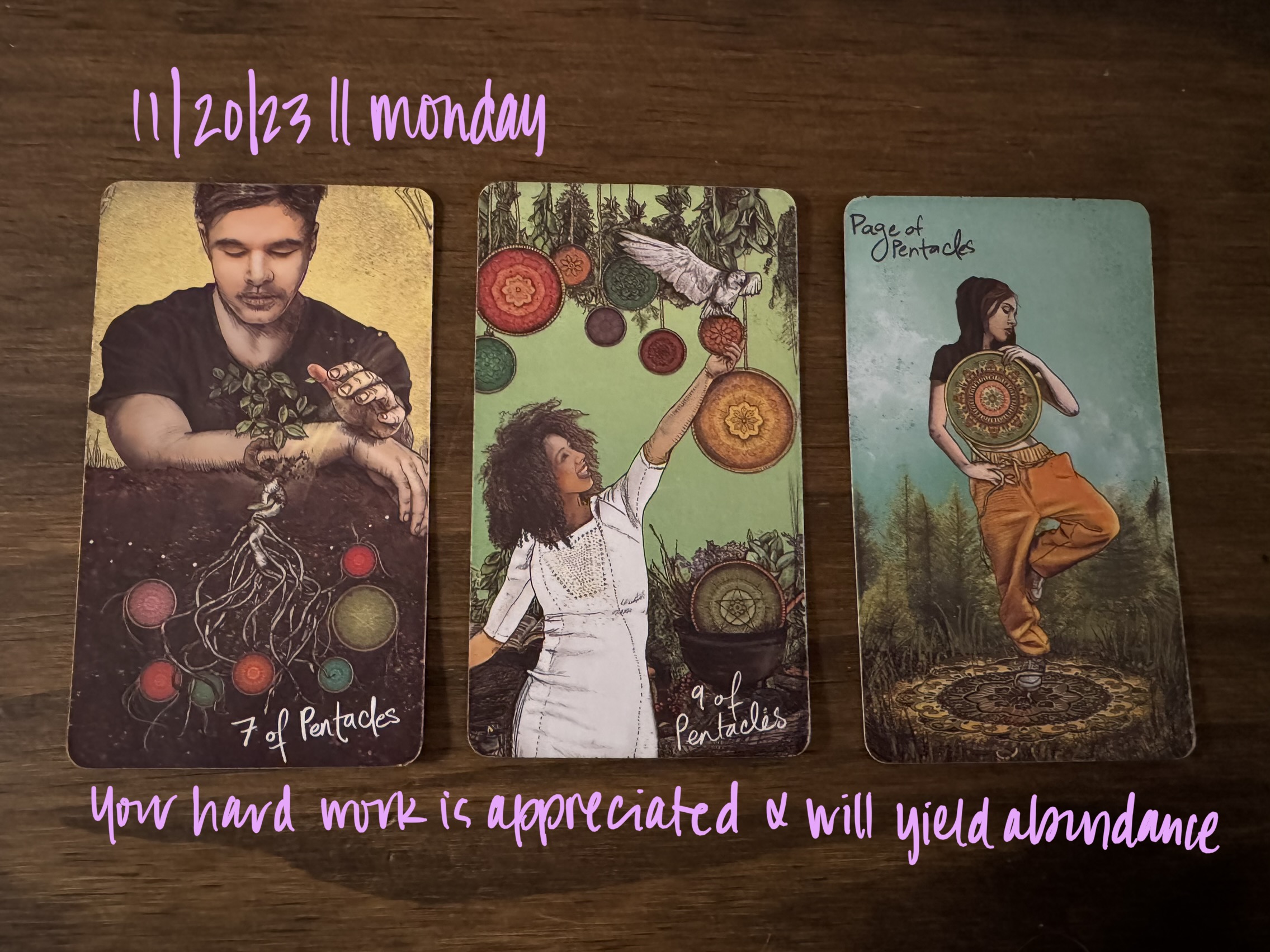The Lightseer deck was definitely talking today! And it wanted to talk about how hard you are working, and the rewards that will pour forth from that labor. In this spread, within the context of these cards, the 7 of Pentacles shows the unseen effects of your work. The plant may look small, but its caretaker is gazing at it with gratitude and love. The root system below is vast, two to three times as large, sprouting from the seeds invested in the soil. What you have set in motion may at times feel underwhelming, but what you can’t see will surprise you soon with its depth and reach. Whatever it is you do for a living—or perhaps the side hustle you feel much more passionate about than your day job—it is obvious that you have put your heart and soul into it. This can feel risky at times; a lack of tangible growth may have you doubting your abilities, talent, and potential. When you’ve put every last ounce of your energy and effort into your passions, small returns may feel discouraging and turn you into your own biggest naysayer. This card is here to reflect and acknowledge the perseverance it has taken for any and all growth to occur, and to assure you that you are on the right path, because it is followed by the 9 of Pentacles.