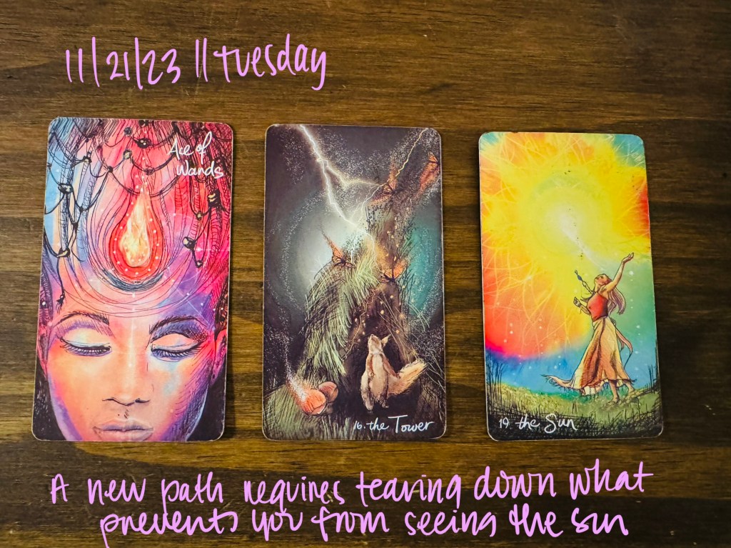 The collapse of your current situation—or any situation—is much more surmountable than you might imagine. There is so much power within you, embodied by The Sun. When the Tower comes crashing down, you will have a clear view of the world around you—no longer living in the shadow of someone else’s construct, you will be bathed in light. Allowing everything to fall away will expose so much that isn’t currently visible. You do not grow by limited access to knowledge and perspective, and if the people around you discourage you from any viewpoint but theirs (which you may have bought into enthusiastically when it felt like a brilliant solution to your difficulties), then it is right to regard it with suspicion. The vibe of these cards impart the sense that you have been kept from asking too many questions or challenging a status quo for fear of upsetting some fragile balance or arrangement. Fragility is not sustainable. Walking on eggshells is doable for a short time, but is it how you want to live your life? Or would you rather harness the power of the sun? Only you can decide what you are capable of living with. We get one life, a jewel far too precious to keep in the dark. Allow the sun to shine on your unique being, and it will show you the path indicated by the Ace of Wands.
