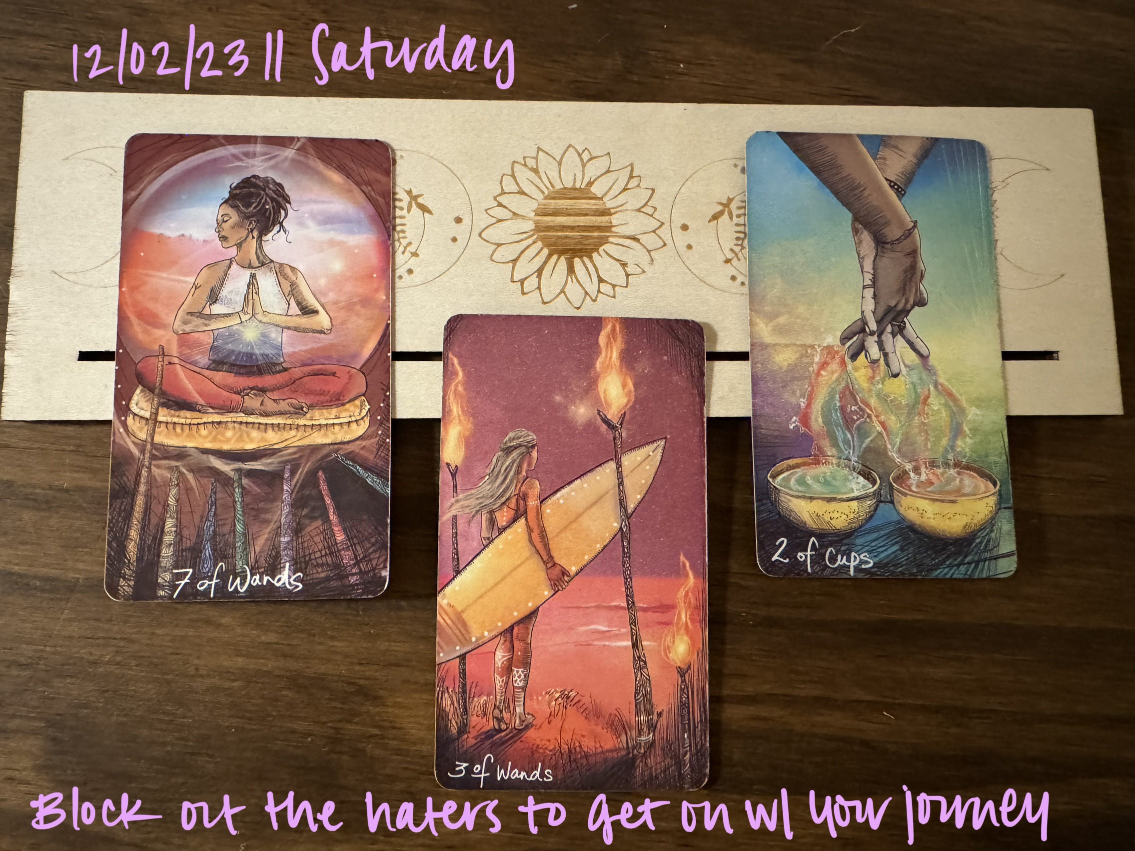 The 3 of Wands invites you to expand on your accomplishments and strengthen your boundaries by preparing for future stages and goals. Like the surfer on the card you are surveying the scene and gauging what you’re up against. You have the right equipment for the situation, but you still need to use your knowledge to plan your approach. Take the time to honestly assess yourself and what you are facing. This is your journey, and nobody knows you and what you want and need like you do. You have been successful thus far—which is what rouses the haters to attack your sense of self—so trust in what you have achieved. You know where you’re going, and anyone who would discourage you in order to prop themselves up is not a friend. There is growth waiting to happen, and especially here it indicates an opportunity to pursue something to do with union and balanced partnership. This could be unity with yourself or with another, whether friendly, romantic, or both. The surfer on the 3 of Wands is looking right at the hands on the 2 of Cups, suggesting to me that the chosen path leads to emotional balance and fulfillment. The hands are equal and intertwined, combining forces to produce the rainbows filling the cups. There is genuine connection out there, and with the surfer looking out on the ocean this is bringing to my mind the song Love Like Waves by Friendly Fires. The overall message these cards impart to me is that you should live for yourself and wrest control of your situation from anyone trying to undermine your sense of self-possession. Wherever it is you want to go, you can’t let the opinions of others hold you back. Use your discernment to separate the wheat (constructive feedback, genuine concerns) from the chaff (destructive criticism, petty meddling). No matter how much planning and careful consideration you give the surf, you still have to take the plunge; you won’t find the rainbows/emotional balance waiting for you until you take a chance on yourself. Naysayers will always say nay, but you can defy them by saying yes to you and what brings you fulfillment, even if it’s unpopular with those around you.
