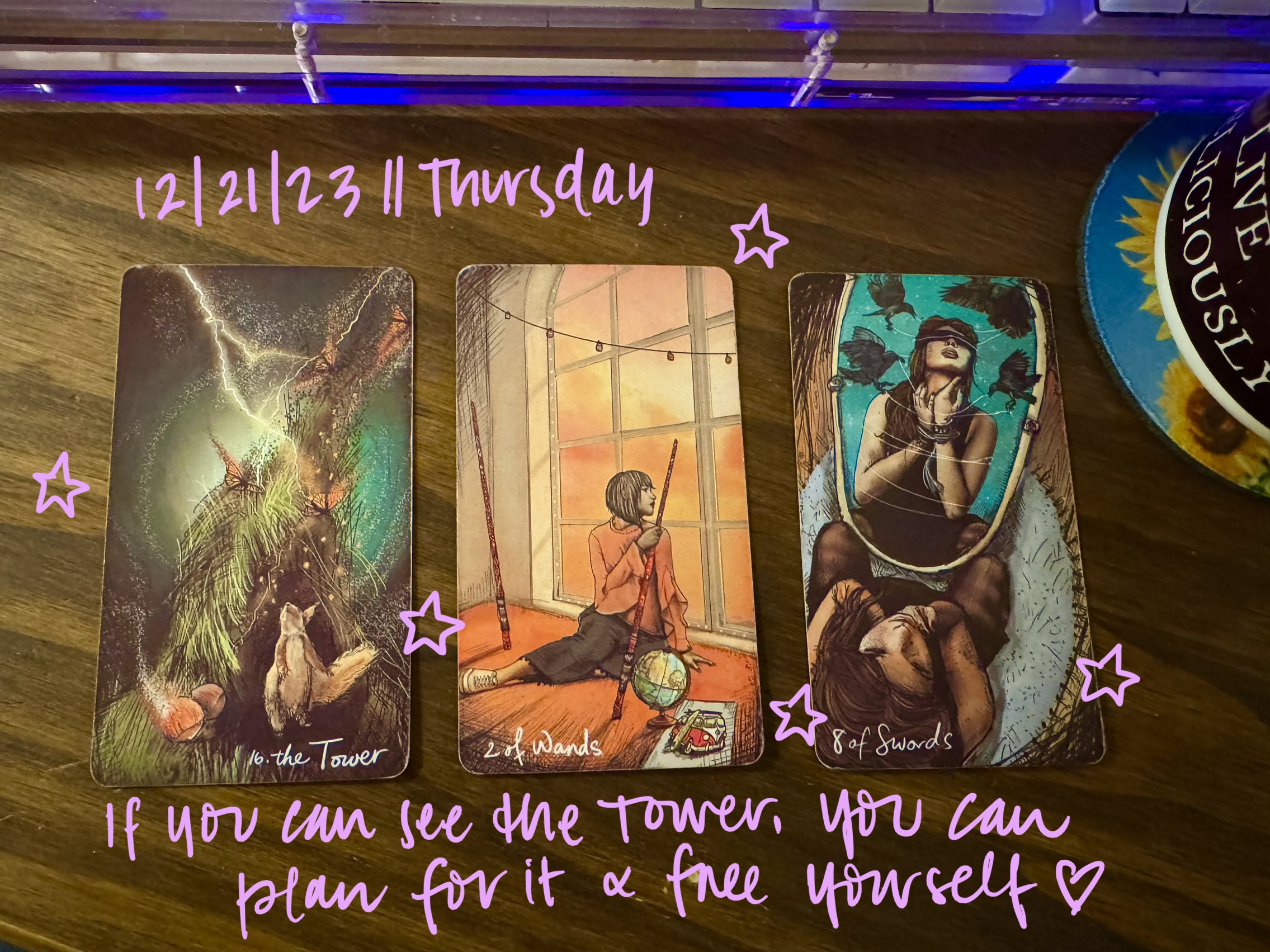 As for the Devil—not pictured—this one didn’t come out but it flipped face up in the deck as I was shuffling, which tells me it wanted to be seen and acknowledged as contributing to the overall energy, but not necessarily as a major player. In this case it feels to me as though the Devil wants to see you free yourself, and believes in your self-sufficiency and ability to slip out of your own shackles. Like the Tower, the Devil isn’t always a terrible or “evil” card; it can actually speak to playfulness and honoring the human spirit. Here it describes you regaining some semblance of your strength or a past self, the one that would never have consented to the binding that has you in an 8 of Swords. Overall: the Tower moment is coming, but you have time to look for it (if you’re not already aware of its presence) and time to prepare—just be careful not to keep yourself trapped up in the top, and remember that it’s okay to prioritize yourself and what you want rather than remaining in a crumbling structure for the sake of others.