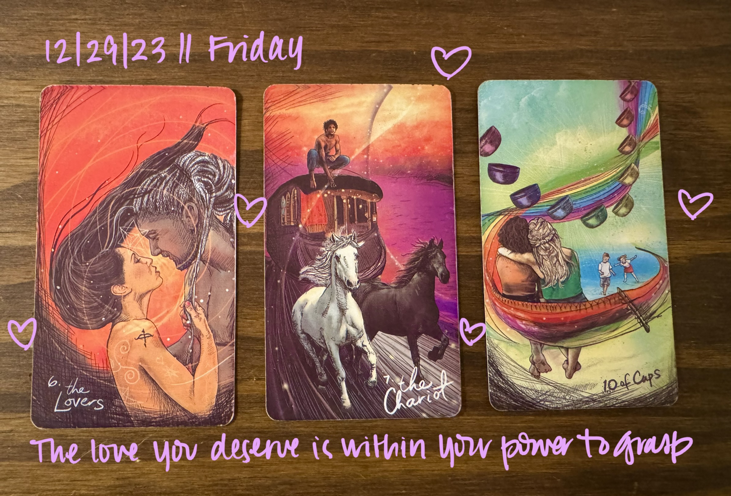 The Lovers, The Chariot, 10 of Cups